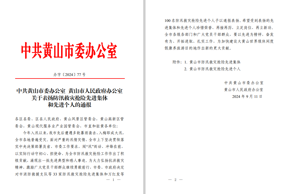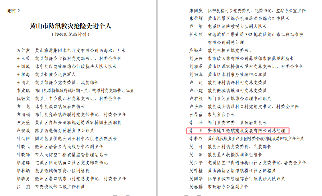近日,黃山市委、市政府辦公室發(fā)布“關(guān)于表揚防汛救災(zāi)搶險先進集體和先進個人的通報”,建工交航皖南分公司李陽同志作為黃山市唯一施工企業(yè)代表榮獲先進個人表彰,安徽建工徽航建設(shè)發(fā)展有限公司是唯一一個施工企業(yè)獲此殊榮。