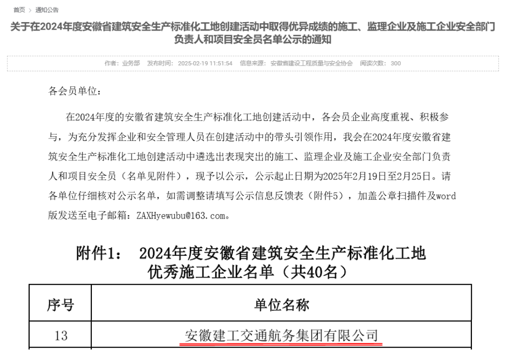 近日,安徽省建筑安全生產(chǎn)標(biāo)準(zhǔn)化工地創(chuàng)建活動(dòng)結(jié)果揭曉,安徽建工交通航務(wù)集團(tuán)有限公司憑借扎實(shí)的安全管理,斬獲多項(xiàng)殊榮。