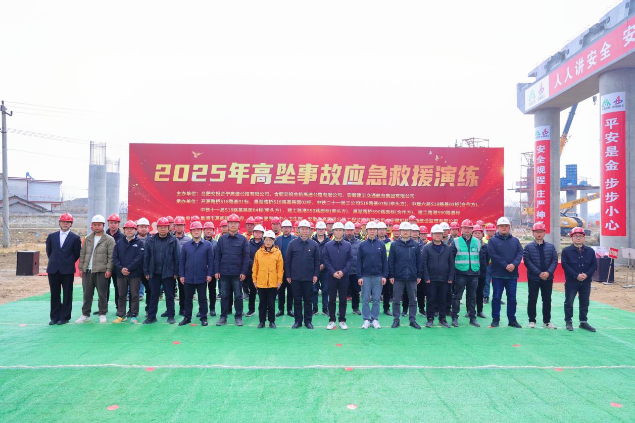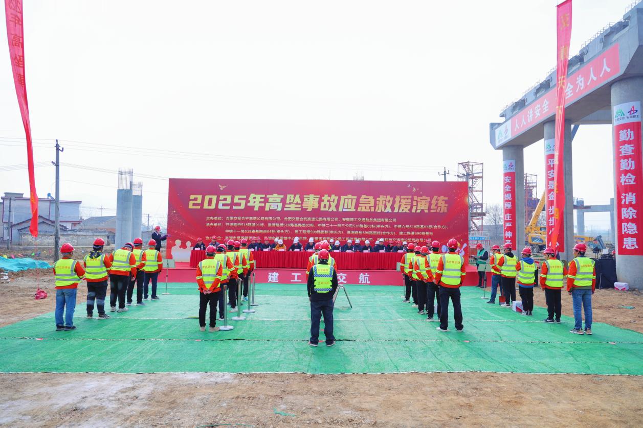 2 月 28 日上午,巢湖市夏閣鎮(zhèn) S328 省道交蕪合高速夏閣東樞紐現(xiàn)澆支架 E 匝道處,一場實戰(zhàn)化的高處墜落事故應(yīng)急救援演練拉開帷幕。此次演練由合肥交投合寧高速公路有限公司、合肥交投合杭高速公路有限公司、安徽建工交通航務(wù)集團(tuán)有限公司主辦,建工交航黨委委員、副總經(jīng)理邢磊,安全環(huán)保監(jiān)察部部長朱云珍參加演練活動,并發(fā)表致辭與點評。