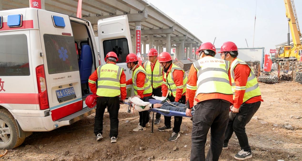 本次演練模擬了在夏閣東樞紐 E 匝道現(xiàn)澆梁支架拆除施工時,一名工人因未妥善系掛安全帶,失足從支架墜落至地面受傷的場景,全面檢驗應(yīng)急預(yù)案實效性。