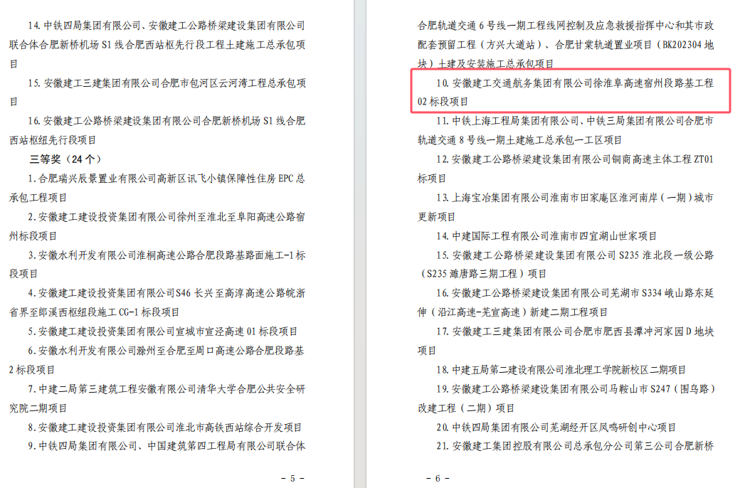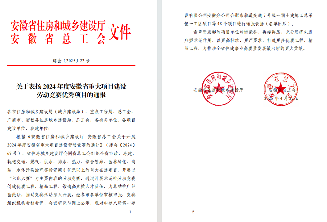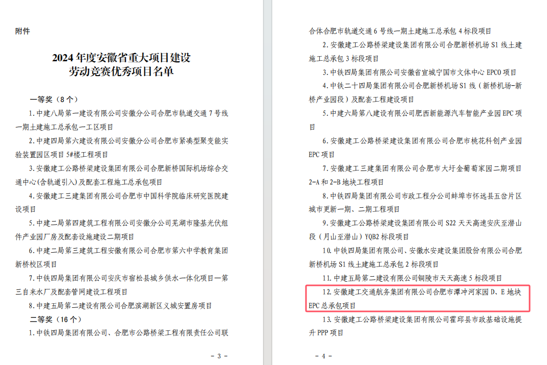 近日,安徽省住房和城鄉(xiāng)建設(shè)廳、安徽省總工會聯(lián)合發(fā)布《關(guān)于表揚 2024 年度安徽省重大項目建設(shè)勞動競賽優(yōu)秀項目的通報》,公司潭沖河家園 D、E 地塊 EPC 總承包項目和徐淮阜高速宿州段路基工程 02 標(biāo)項目表現(xiàn)突出,成功入選優(yōu)秀項目名單。